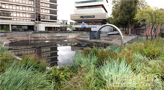 廣場附近和屋頂?shù)乃紩?huì)被收集到盆地中,在廣場中間行成三個(gè)小湖。城市的運(yùn)河系統(tǒng)有足夠的容量允許水的流入,盆地內(nèi)的水慢慢的消失,再一次將活動(dòng)空間騰出。同時(shí),水廣場的概念還改善了城市開放水環(huán)境的質(zhì)量,防止不干凈的水直接流入運(yùn)河中。