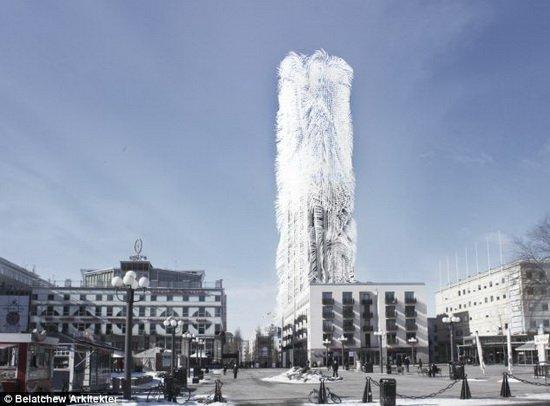 藝術家描繪的瑞典首都“多毛摩天大樓”,這種多毛結構事實上是纖細的纖維體,隨風飄動可將風能轉化為電能