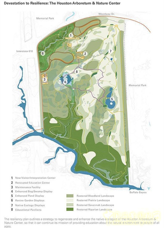 休斯敦植物園和自然中心位于當地一個紀念公園內,占地155英畝(約63公頃),由于長期遭受惡劣氣候(颶風、干旱等),其生態狀況不容樂觀。該植物園修復計劃的核心是對場地的自然與文化遺產進行詳盡的評估、對氣候影響進行診斷,擴大利益相關者的參與度。修復計劃可有效促進植物園更彈性化的發展,也可為其他面臨同樣威脅的地區提供經驗。