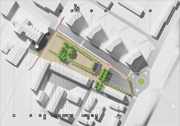 U型立體坡道廣場的坡度為9度,方便市民攀爬,同時也方便殘疾人士。整個坡道開放友好,可為市民提供蔭涼,同時還滿足全年使用,支持活動、 會議、宴會、展覽、戶外電影等等多用途使用。在坡道的上方,市民可以進行多種休閑活動,在坡道的下方,可以根據(jù)需求設置商業(yè)空間或者游戲區(qū)、電話亭、長椅、候車區(qū)、廁所等。