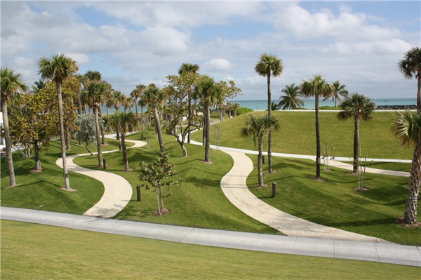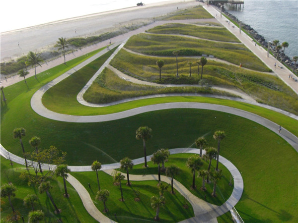 與穿越道直來直往的走勢不同,蛇形道從大西洋海灘道開始隨意地迂回蜿蜒,上行處可見大西洋的海闊天空,可至園中涼亭的高處觀景,一直西行則可拐入海灘道。這種地形讓人們在行進過程中移步換景,令人心曠神怡。這中多變的地形在公園中很多小角落均有體現。海岸邊蜿蜒地形上的原生植被與抽象的沙丘地貌以及蜿蜒道內坡的棕櫚樹形成鮮明對比。一小片公園區域的原生植被、棕櫚及落葉喬木組成的海邊植物帶與蜿蜒的小道形成呼應。附帶有下層植被如青草及蕨類的棕櫚科灌木叢為公園北緣的城市環境創造了一個緩沖帶。設計意圖通過將華盛頓大道和濱海大道延伸至公園——在連接處設計硬質鋪地入口廣場,以達到將公園融入城市肌理的目的。