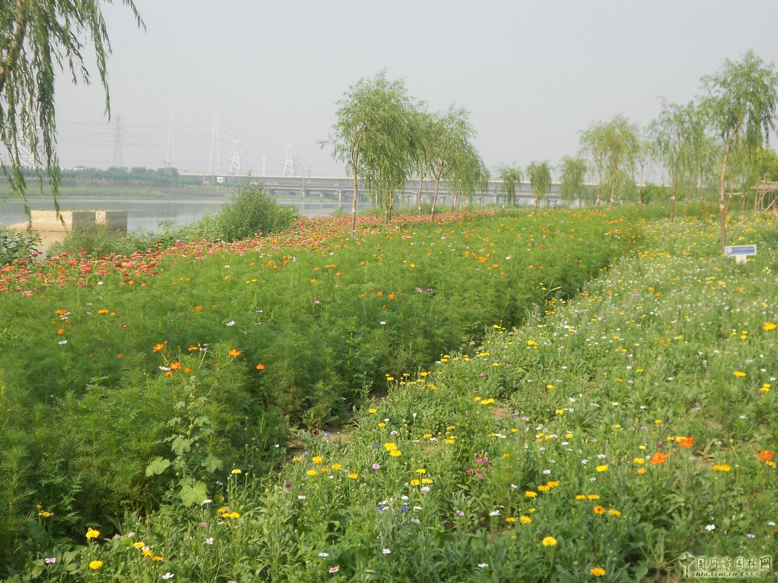 北郊生態(tài)公園中區(qū)造林綠化工程地點(diǎn)位于天津市北辰區(qū)新引河河道。由于工程需要大面積種植草花,因而從提升景觀效果、保證工程質(zhì)量考慮,在12651㎡范圍內(nèi)采用了草花混播技術(shù)。根據(jù)土壤氣候條件及植物生長(zhǎng)習(xí)性相近原則,選取一年生及多年生的花卉品種10~12個(gè)合理配比種類、數(shù)量,以2~2.5g/㎡播種。建植初期通過(guò)深翻表土、采用底土播種或客土10~15cm有效地控制了雜草的生長(zhǎng);后期進(jìn)行了適當(dāng)?shù)男藜艉椭旮呖刂疲罱K達(dá)到了花色范圍廣,開(kāi)花時(shí)間長(zhǎng)的目的,而且高度模仿自然生長(zhǎng)情況,取得了良好的景觀效果。