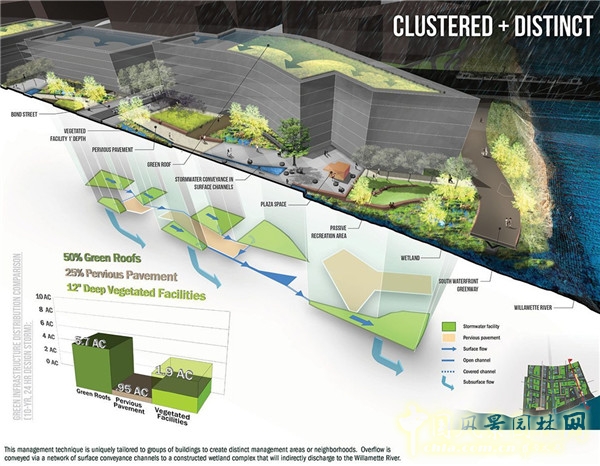 聚集及區(qū)別性處理方案:在街道及周邊地區(qū)的雨水管理中采用了集中和分散的系統(tǒng)。1.9英畝(約0.77公頃)大、12英寸(約0.3米)深的城市雨水種植器可收集、吸收原本不透水區(qū)域的雨水。