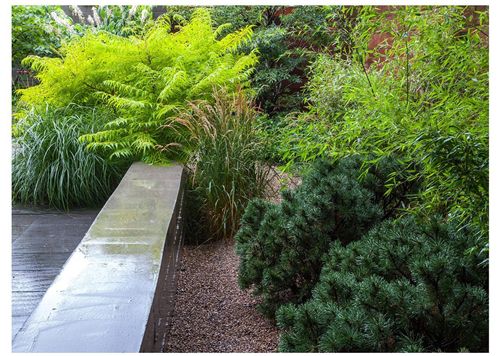 花園道路在房屋的南部沿線上,位于玻璃墻面以及6英尺的混凝土墻面之間,連接了公共道路與西花園。過渡的第二個空間被認作是冥思空間,帶有自己明顯的特征。大型粗糙的花崗巖和小卵石混合,內部種有野生姜、老鸛草、落新婦、淫羊藿、蕨類植物以及心葉牛舌草。凌霄花和繡球花攀爬在混凝土墻面上,和野獸主義設計的表面正好相反。