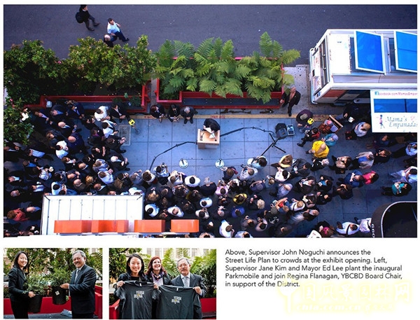 左圖:項目主管金貞妍(Jane Kim)及舊金山市市長李孟賢(Ed Lee)一同為“移動的公園”的揭幕種下首株植物。
