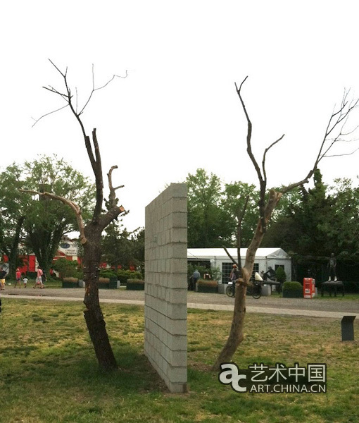 Gabriela Albergaria的雕塑作品《平衡關系中的兩棵樹》(“Two Treesin Balance”)(2015)從美學角度呈現了一堵墻與兩棵樹之間的沖突與矛盾的關系。與以往有圍墻的花園中的樹木不同,這兩棵樹由廢棄的木料組合而成,藝術家將這兩棵樹種在離墻邊不遠的地方,兩棵樹像是隔著這堵墻遙遙相望,也像是處在對立的兩個立場,關系無比緊張,有一種生長的力量,似乎要摧毀中間的那堵人造的墻,也寓意著消除國家與國家之間,人與人之間,人與自然之間的對立與隔閡。這件作品所用的材料是藝術家在城市周邊收集的廢料,將廢棄的樹枝,金屬,磚塊等做成了這件作品,代表了藝術家對于生態問題,社會問題以及政治問題的思考。