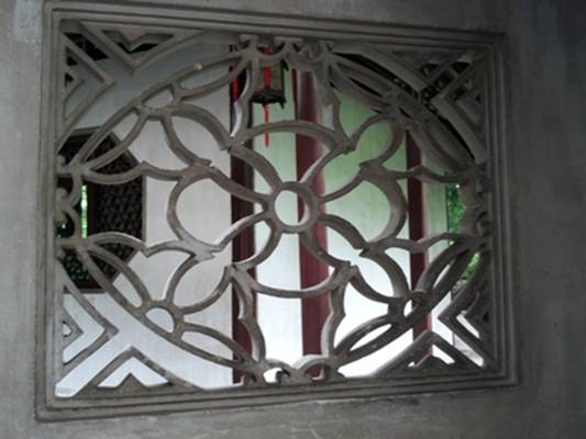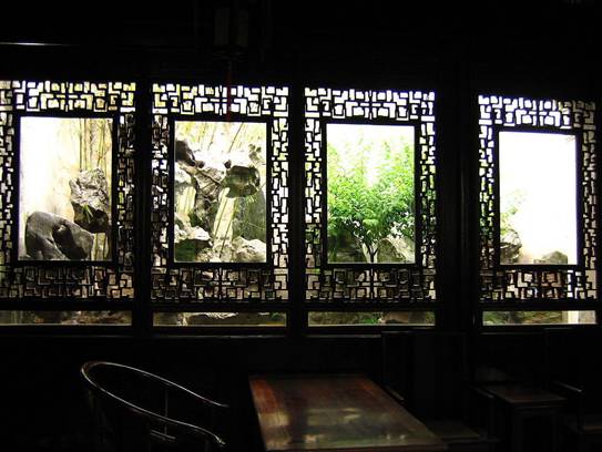 “竭力將生活詩意化,藝術(shù)化,這是我們從洞門花窗中看到的吳中文人清雅文化風(fēng)范的又一側(cè)面。除窗框有瓶形、扇形和植物性外,窗的圖案有的是文人風(fēng)雅的象征物。如獅子林小方廳北小院的北墻上四扇花窗的圖案分別是琴、棋、書、畫,小小庭院,綠蔭深處,似乎充滿了文人士氣、書卷味。退思園九曲畫廊壁上開辟了九個圖案雅致的漏窗,漏窗中用磚石分別砌上‘清風(fēng)明月不需一錢買’,這正是唐李白《襄陽歌》中的名句‘清風(fēng)明月不用一錢買,玉山自倒非人推’,用在這里,旨在告訴人們:園中的自然美景、賞心悅事可以令人醉到不起。詩被物化了,景被詩化了,詩境、園景已融為一體。”