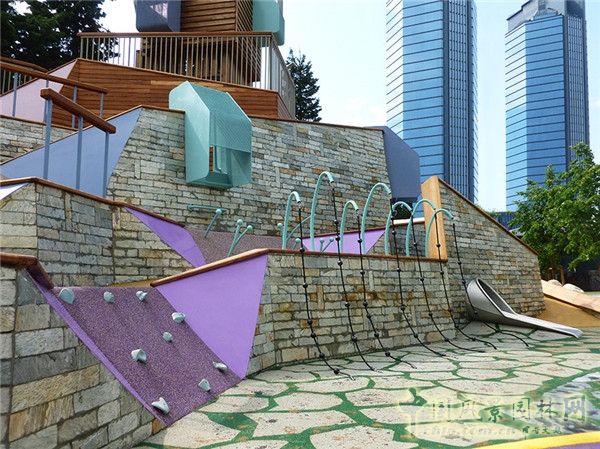 在深谷的周圍有一座“山脈”作為其布景。屹立于此的數(shù)面墻壁展現(xiàn)出了無(wú)限的游樂潛力,孩子們可以在此攀爬、賽跑、捉迷藏、滑滑梯等,也可由此俯瞰游樂場(chǎng)的其他區(qū)域。從整體來(lái)看,所有的墻壁又共同構(gòu)成了一塊巨大的布景,游客從不同的觀景角度可欣賞到迥異的形狀。這里簡(jiǎn)直就是探險(xiǎn)的圣地:錯(cuò)綜的隧道迷宮、大型的滑梯、“鳥巢”、瞭望臺(tái)、窄巷等等,不一而足。一旦進(jìn)入山脈中,孩子們就可探索發(fā)現(xiàn)不同的通往山頂?shù)牡缆贰;菀郎焦榷ǎB接起了游樂場(chǎng)中的兩個(gè)區(qū)域。