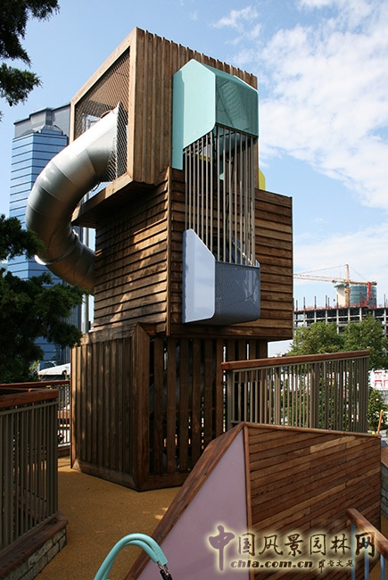 在游樂場中,設計師打造了兩座塔,可供在塔中俯瞰整個游樂場。兩座分別為三層及四層高的塔樓位于游樂場中最高的區(qū)域,塔身并非傳統(tǒng)的幾何形狀,不同年齡階段的兒童可根據自身的能力攀爬到不同的平臺。時而透明時而未知的道路為探索中的世界埋下了無數的可能。
