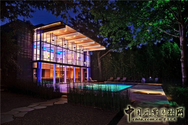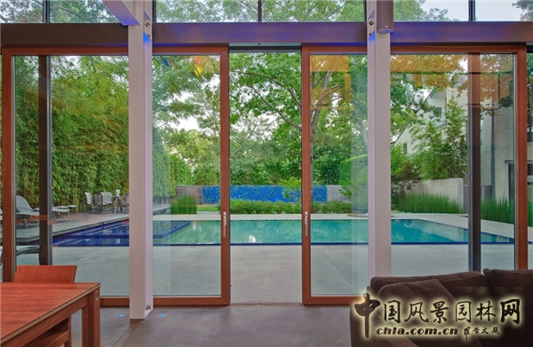 而建筑的南立面則是由零框架且隔熱的玻璃構成,中央則安裝有兩扇8英尺(約2.4米)寬的玻璃門。14英尺(約4.3米)寬的懸臂式屋面既可有效遮擋得克薩斯州灼熱的日光,也可作為通向無邊界泳池的走廊。