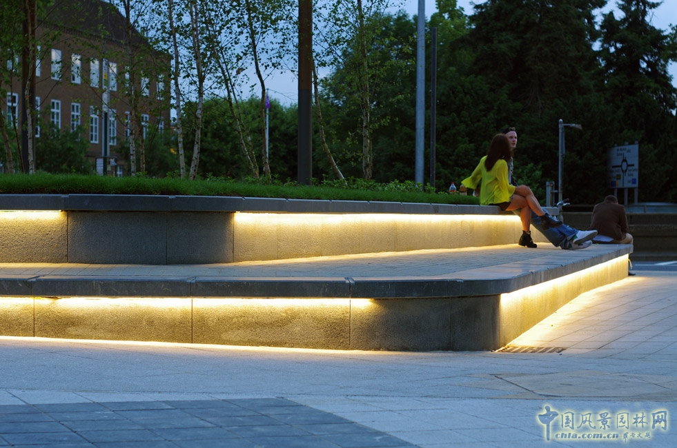 路燈和照明系統(tǒng)被升級,新的照明方案是為了吸引更多的游客在傍晚或者夜間來這里。被照亮的橋散發(fā)著浪漫的氣氛,被點燃的噴泉和坐凳下的條形照明燈都使這里更具吸引力。