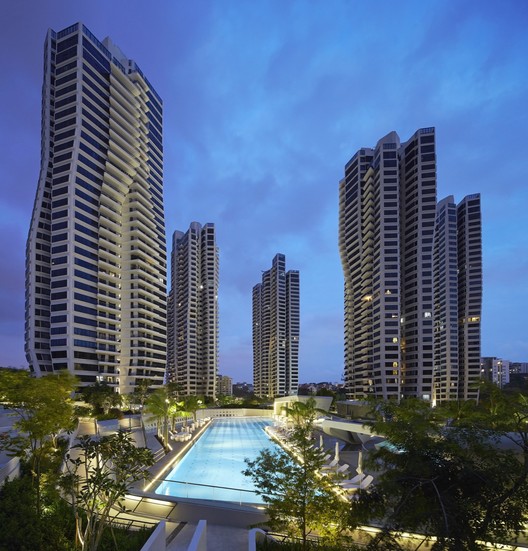 公寓有70%的綠色植被覆蓋,其中還包括彎曲的踏步和高聳的景觀形式。階梯狀的景觀平臺(tái)最大限度的擴(kuò)大了公共空間的面積,其中除了spa、體育館和水池之外,還包括一系列圍繞氣味、運(yùn)動(dòng)、迷宮、象棋、雕塑和懸掛植物為主題的花園。這些優(yōu)美的綠色景觀還一直延伸到建筑內(nèi)部,特殊設(shè)計(jì)的開窗讓居住者能觀賞到武吉知馬自然保護(hù)區(qū)和植物園的景色。