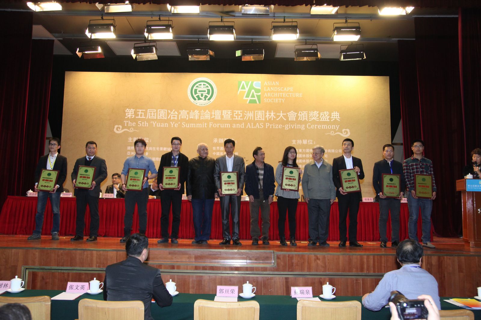 國際著名景觀設計師道格拉斯·庫曼(左1)、亞洲園林協會主席王小璘(右3)為獲獎企業頒獎