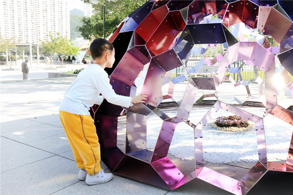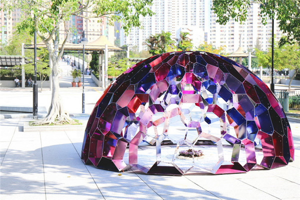 “萬花筒穹頂(Kaleidome)”是一個由262塊獨立多面體元件拼合而成的鏡面不銹鋼構筑物。每一個反光單元就像一個小窗格,框出室內外環境。它好似一個萬花筒,不斷變換著河流、樹木、建筑、行人、花朵等的圖像。“萬花筒穹頂”由LAAB設計完成,是為一個由香港青年藝術協會組織的2015年賽馬俱樂部社區藝術雙年展而設計的公共藝術裝置。