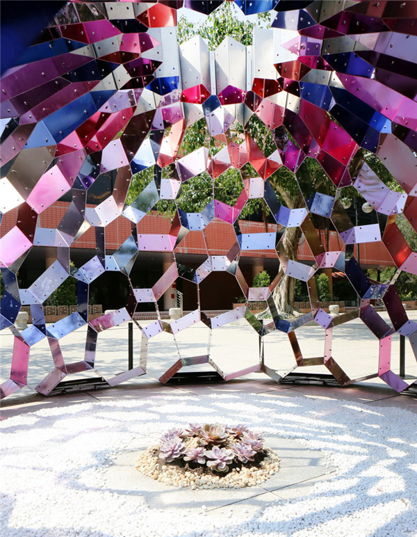 “萬花筒穹頂”采用先進的計算機編程和數字化制造技術設計完成,總共通過激光切割出22個各不相同的形狀,形成262個單元格。切割之后,每塊板材通過折疊成為與LAAB建出的參數化電腦模型相對應的獨特元件。通過這樣的建模手段盡可能最大化了裝置體量同時最小化了板材消耗,同時也解決了諸如高度限制、面積小以及預算緊縮方面的問題。“萬花筒穹頂”目前正在香港沙田公園展出。