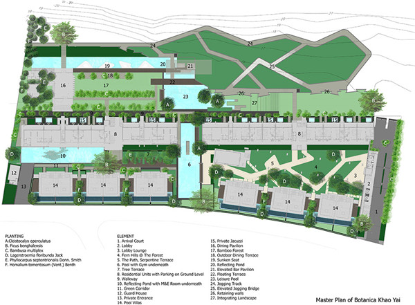 受到附近山脈和泰國最大雨林考艾的啟發(fā),本案景觀設(shè)計旨在建筑和自然間創(chuàng)造聯(lián)系。設(shè)計并未試圖制造一片虛假的自然雨林,相反,這個項(xiàng)目的建筑可理解為大樹,而景觀美化則是大樹下的綠色地被。景觀成功利用不同光照條件打造出人造可持續(xù)森林,鼓勵居民去理解并欣賞大自然。