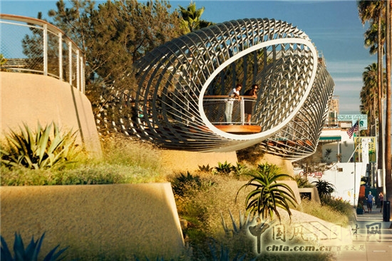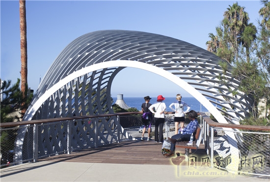最引人入勝的便是造型新穎的觀景平臺,離地約18英尺,曲線型網狀涼亭,人們可以在平臺上,俯瞰一望無際的太平洋,聆聽海洋的呼吸,還可以看到不遠處的圣莫尼卡碼頭上的摩天輪以及海灘上的熱鬧人群。