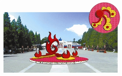 東門花壇主題為“五谷豐登”,選取中國少數民族傳統服飾的主要顏色和部分元素,用植物材料及五谷制成舞動水果人偶。東廳主題花壇名為“情聚山河”,以北海公園特色花卉菊花、荷花為設計元素,結合傳統吉祥紋飾和框景設計,制成由各色小菊和五色草扦插的花壇主體構架。