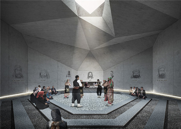 利用明顯的不同的材料和體驗變化,宗教大廳被與非朝拜區和文化中心區分開。建筑的屋頂景觀、露臺和庭院布局錯綜復雜,不僅豐富了訪客的游覽體驗,相互之間的交流也變得更加簡單易行。建筑沒有遵循一般的建筑法則,而是以文化可持續為核心,著力于設計一處適于教育和紀念活動的公共空間。