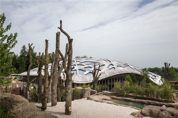 這座大象館有一個驚人的木屋頂,其形式自由,與周邊森林建立了有機的聯系,同時屋頂還能模擬再現森林中復雜的光環境:當陽光穿過屋頂斑駁的天窗,就像穿過叢林層層的樹枝。