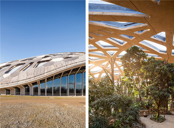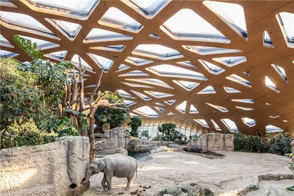 大象館屋頂自由輕巧的木外殼采用了預制三層板,然后在現場進行彎曲和造型處理。整個形體更具結構需求不斷變化著,最終成就一個動感,自然,與景觀共生的建筑。
