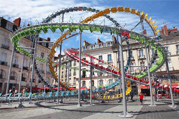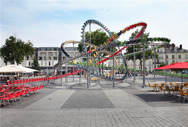 設計師巴蒂斯特·狄彭布(Baptiste Debombourg)經常將人們意想不到的材料轉變成新奇的東西,這也讓他備受關注。他的新作‘Stellar(星球)’——空中雕塑也是這樣完成的。由1200把咖啡椅組成的‘Stellar’立身于法國南斯Place du Bouffay的公共廣場中,其形狀讓人聯想到過山車的樣子。在‘Stellar’周圍有很多的室外咖啡館和餐館,因此在創作之初狄彭布便決定用咖啡椅作為‘Stellar’的原材料。