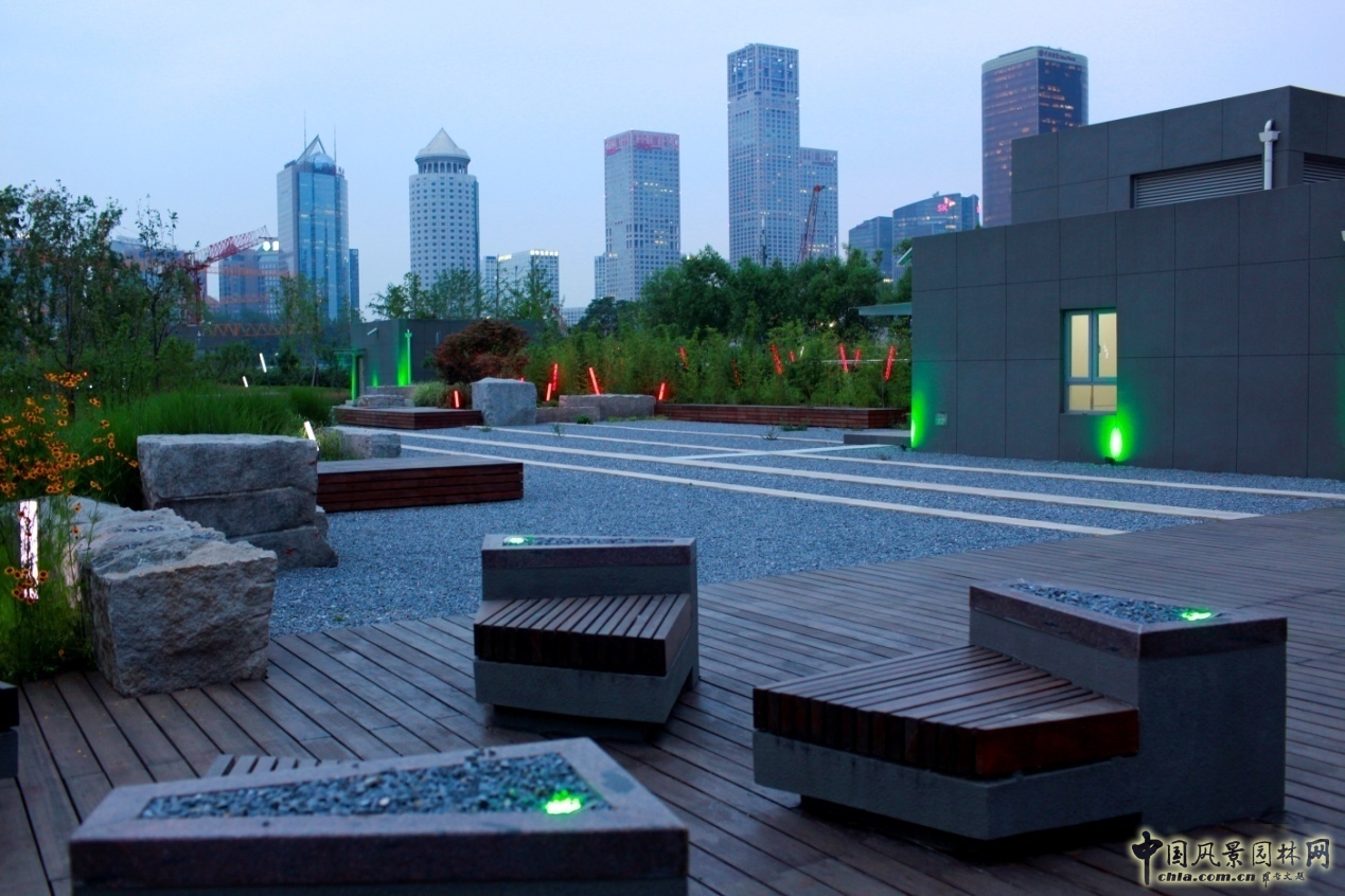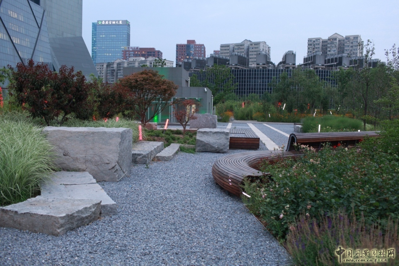 結(jié)合車庫人防出入口,設(shè)置安靜休憩的場所,在材料上選用整塊的料石、木坐凳、散鋪的礫石,與園內(nèi)自然地風格相協(xié)調(diào),給人以安靜、質(zhì)樸之感。