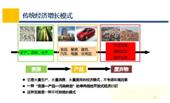 這種工業(yè)發(fā)展的模式可以概括為傳統(tǒng)的線性發(fā)展模式,資源采掘——形成產(chǎn)品——消費——廢棄物——填埋處理,這種模式運行中以大量的使用化石燃料、機動車,城市蔓延式擴張、追求大而舒適為目的。它是一種大量生產(chǎn)、大量消費、大量廢棄的經(jīng)濟模式,使人類的生活從搖籃走向了墳?zāi)埂?/p>