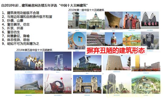 在建設(shè)改造過(guò)程中,還要防止“大、洋、怪”現(xiàn)象。自2010年起,某媒體連續(xù)五年評(píng)選“中國(guó)十大丑陋建筑”,其中有很多建筑使用功能極不合理,外觀抄襲嚴(yán)重,盲目崇洋、仿古等,這些都對(duì)于弘揚(yáng)民族文化起到了負(fù)面影響。