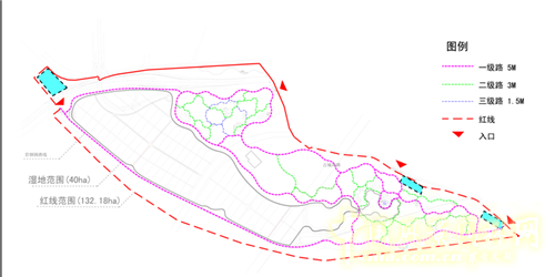 整體交通方面情況如下:一級(jí)道路寬5m,二級(jí)道路寬3m;三級(jí)道路寬1.5m,全面覆蓋園區(qū),保證各個(gè)景點(diǎn)的可達(dá)性。