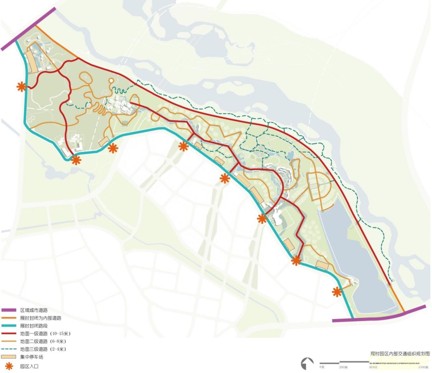輔助交通主要有兩種模式:第一,在北部濱河區域設置七個游船碼頭,利用水上交通,加強園區東西向聯系。第二,利用濱河路和園博軸設置園區電瓶車輔助交通線路并設置了十二處站點,方便游客使用。