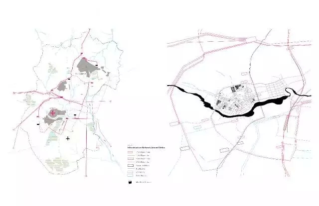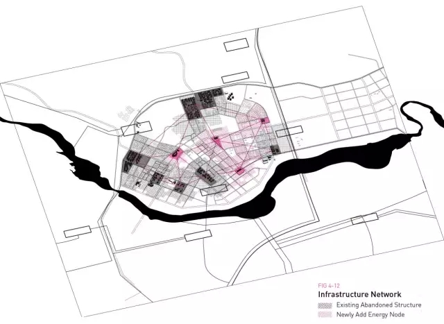 接著當我把鄂爾多斯的所有輸電線,天然氣管線以及輸水管線(現存+規劃)map出來之后,巧合的是這些管線的節點恰巧分布在空置或爛尾樓聚集區域的周邊。結合地下的管網以及改造成數據中心的高層結構,這些區域在植入更豐富的基礎功能后,有潛力發展成為支撐城市運行和工業發展的基礎設施基地(Infrastructure Farm/Energy Farm)。