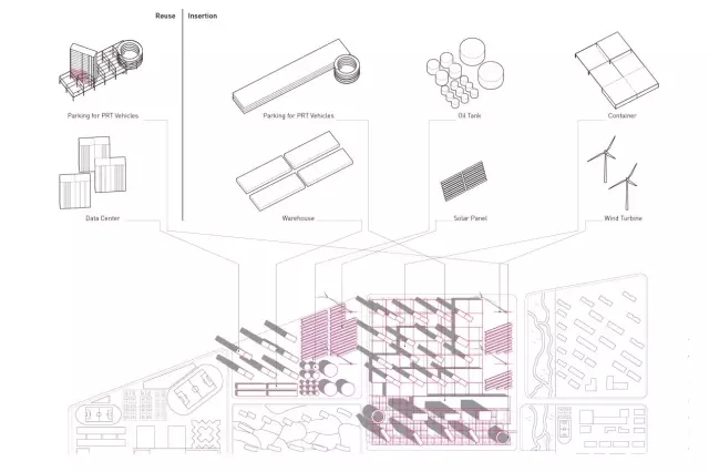 過剩結構的不同情況將有不同的可能性:城市周邊地區的將全部作為基礎設施基地;散落在社區內部的將作為能源工廠為周邊提供能源,其中結構強度達到要求的可轉化為經濟適用房;未覆蓋區域則需添加一定的設施,在全市形成網絡,地面層可作為城市公共空間。