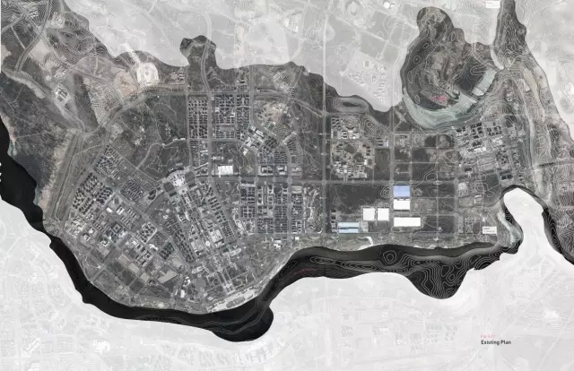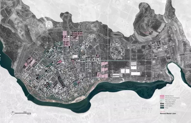 一系列的框架和原則之后,新的鄂爾多斯藍(lán)圖也將出爐。圖中白色肌理為新增建筑,紅色區(qū)域?yàn)閷⑦^剩結(jié)構(gòu)轉(zhuǎn)化的基礎(chǔ)設(shè)施基地,火車站則坐落在城市中心。