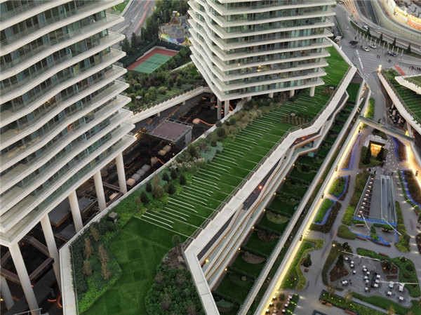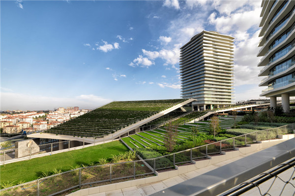 項目中更多利用的是其外向型擴展,整個項目結構外圍的弧形外墻與伊斯坦布爾市的小山丘毗鄰,此處設有兒童游樂中心。該公共空間已經成為了全新的市民社交區域,其貼近自然的景觀也淡化了佐魯中心固有的購物中心性質。大范圍的屋頂綠化成為了景觀設計中的亮點。