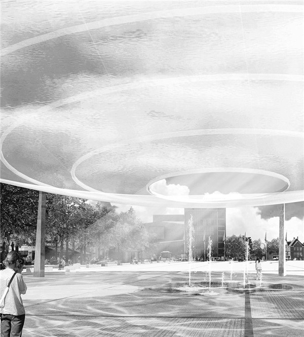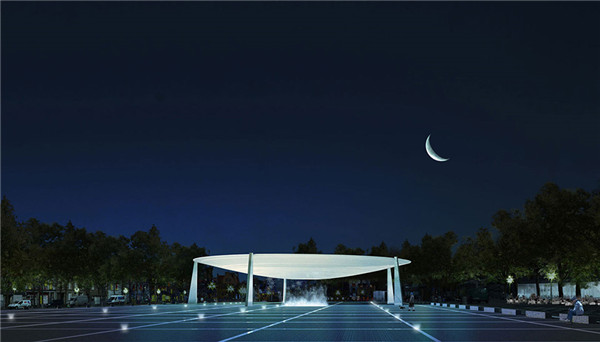 廣場的北面有一個與廣場等寬的半透明圓形亭子,亭子頂部造型就像一個底面正中有個圓洞的漏碗。正對著圓洞的地面位置設置了水池和噴泉,在這里因為水與光的互動,產生了更為變化莫測的氛圍與體驗。中央廣場的水噴泉是這個寬敞廣場的另外一個亮點。