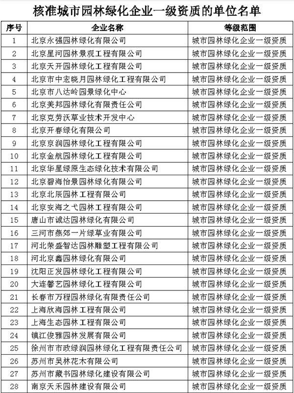 根據《中華人民共和國建筑法》及有關建設工程類企業資質管理規定,現將我部審查核準的城市園林綠化企業一級資質單位名單予以公布。未予批準的,申請人可登錄我部網站(www.mohurd.gov.cn),點擊辦事大廳中“城市園林綠化企業資質核準 ”在線申報欄目進行查詢。