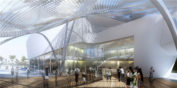 景觀塔不應該是一個孤立的個體,它與公園空間環境之間的關系不是“割裂”而是“共存”。三條張弛有力的曲線從東、西、北三個方向飛馳而來,輕盈地掠過湖面,共同盤旋上升,直沖云霄;筆直的塔身與旋轉的曲面相結合,剛硬又不失優雅。 北線和東線取代了當前公園方案中的簡易浮橋,鋼筋混凝土鑄造的橋身與主塔融為一體,渾然天成;它們同時也為人們直達塔座二層的休閑咖啡廳與餐廳提供了捷徑。