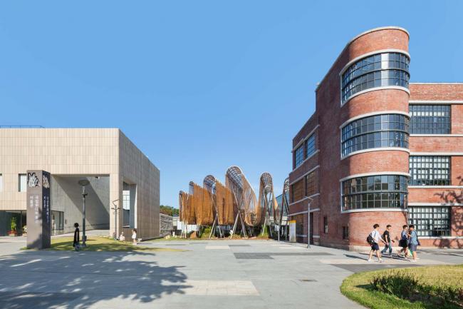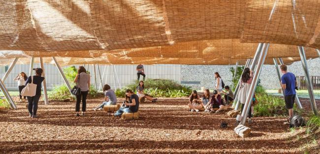 “屋頂?shù)那楦?rdquo;可以說是一座巨大而又靈活的百葉窗,蛇形的外形和由高達的柱子支撐在最高的點,這部分的屋頂在風(fēng)中能夠搖擺著自由移動。而在建筑下則有著長凳子可供有人小憩。 頂部的圓形圖樣暗示了當(dāng)?shù)氐沫h(huán)境,這些場景微風(fēng)使屋頂左右搖擺。