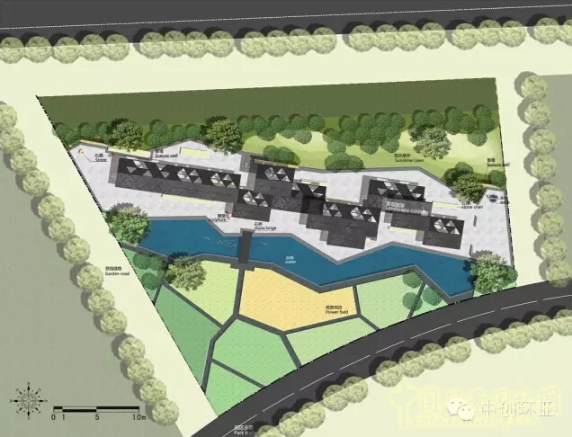 “鄉園”的布局結構,靈感來自中國鄉村梯田“層層疊疊”的印象,田中屹立著驅趕鳥蟲的“稻草人”。沿著田埂間的小路前行,能看見遠處鱗次櫛比的屋頂和斑斕的玻璃窗。走過田間小路,伴著溪水叮咚,來到蜿蜒向前的石板小街,偶爾一陣風吹過,水面波光蕩漾,美不勝收。