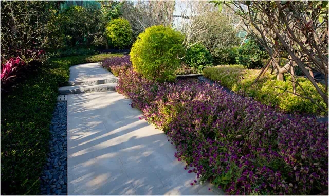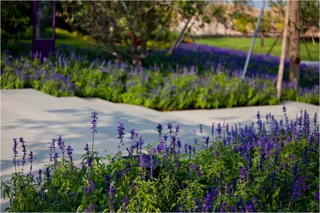 該項目的設計理念源于對基地河流的感受,通過對山巒、曲岸及水脈的現代演繹,利用整體和兩側的落差處理,使得整體景觀空間流暢而富有變化,營造出曲岸觀瀾的現代自然山水意境。整體景觀空間布局的錯落有致,兩側的樹陣和花境,更添靈動細膩的感覺。