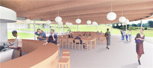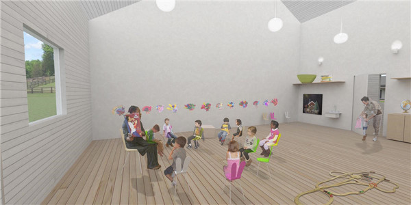 此外,先前的一處谷倉經(jīng)過改造作為服務(wù)中心,在兩翼都設(shè)計(jì)有歡迎空間。該建筑中也包含了許多日常的功能,有教室、一處藝術(shù)工作室、安裝有彈性地板的排練空間、辦公室、休息室、幼兒園以及下沉式食品儲(chǔ)藏室。