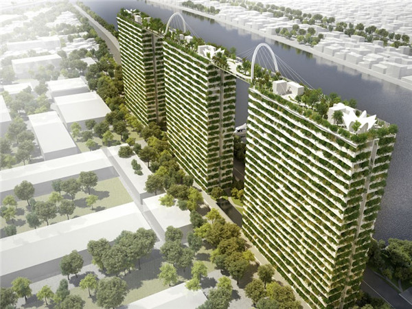 Vo Trong Nghia建筑事務所以其善用植物而聞名,他們設計的大型住宅方案“鉆石蓮花”可以服務720個家庭。小區包括三個獨立的公寓樓,他們通過一個橫跨三個建筑體量的屋頂花園相互連接。