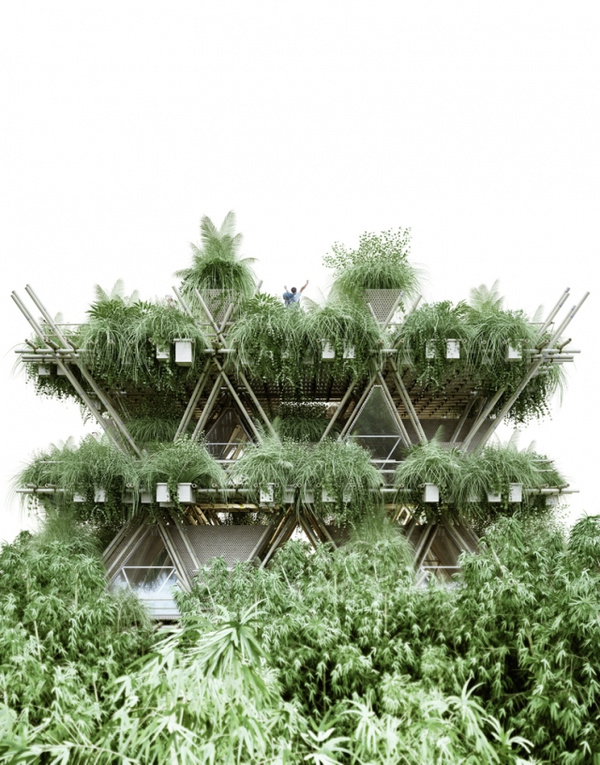 這是完全由竹子和繩索的結(jié)構(gòu)體系。安裝完全模塊化,生態(tài)化,沒(méi)有任何釘子或螺絲釘,使用的所有材料均100%可回收,以便于各個(gè)方向展開(kāi)研究。在BJDW,游客將植物編成籃子被連接到展館。植物將沿著結(jié)構(gòu)生長(zhǎng)并經(jīng)過(guò)一段時(shí)間后,自然將成為主要的設(shè)計(jì)元素。
