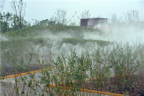 花園入口,人們進入朦朧的云霧中,云霧縈繞在人們身邊,如披肩、輕紗、長裙……人們可以假裝使其移動,切割、旋轉(zhuǎn)它們,更可以和它一起舞動,自由穿梭,讓人們體驗到法國那獨有的浪漫情懷。