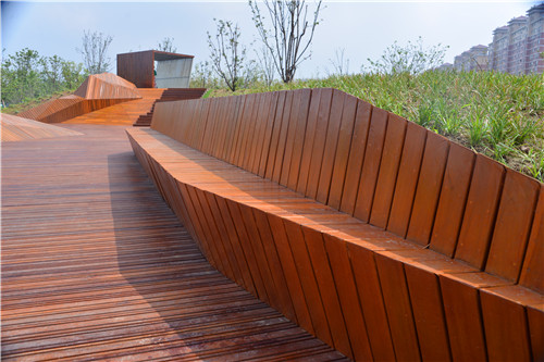 木質(zhì)道路,沿著起伏的地面蜿蜒盤旋。木質(zhì)結(jié)構(gòu)穿過花園,提供了不同的路徑感受和游樂場所。它造就了一個可以倚靠的媒介,而且也包住了長有植被的小山丘。它又像一個長椅,提供了游戲和捉迷藏的空間。