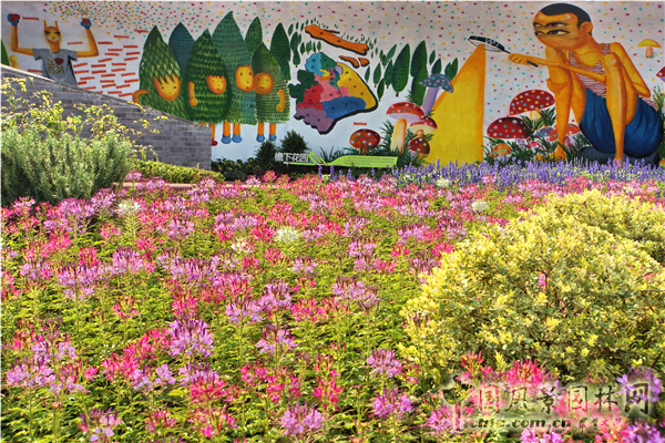 在上海園的檐下花園的彩葉植物展示區(qū)有一面長達30m的混凝土背景墻,如何讓傳統(tǒng)的混凝土再現(xiàn)光芒是設(shè)計方一直思考的重點。主要采取了以下策略:(1)采用網(wǎng)架搭建技術(shù)構(gòu)筑雙曲面墻來柔化混凝土質(zhì)感。(2)采用絢麗彩色涂鴉彌補混凝土的冰冷,增添趣味性和互動性。
