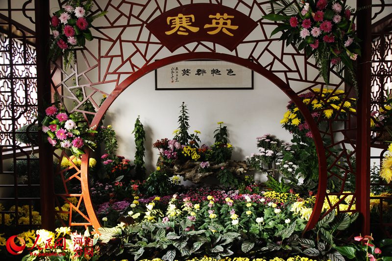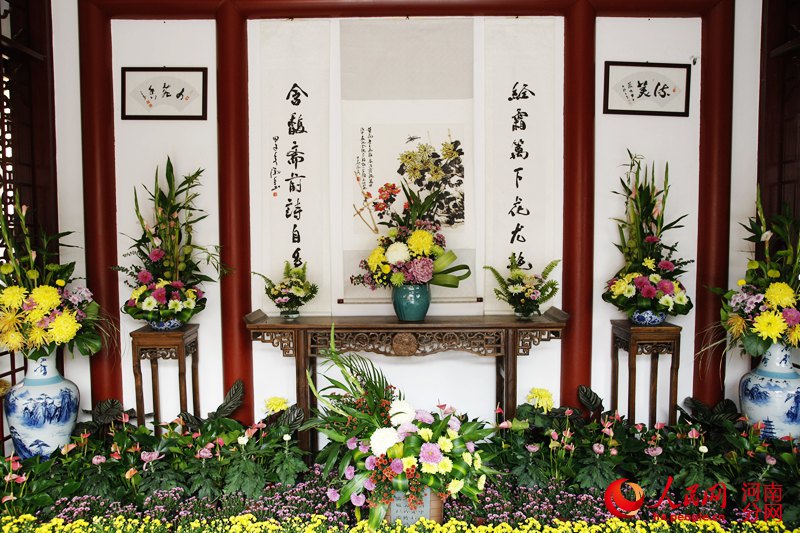 中國館主要展示中式藝術插花,長條幾案、花架、中堂、對聯、青花瓷等體現了濃濃的中國風。