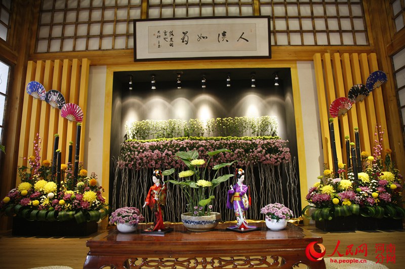 亞洲館裝飾風(fēng)格以日式為主,北側(cè)廳的茶室用不同的花藝裝飾,正北墻一組大型插花在五彩燈光映襯下格外醒目。墻面上的和扇、茶桌上的人偶體現(xiàn)了亞洲主題,花落無言、人淡如菊。