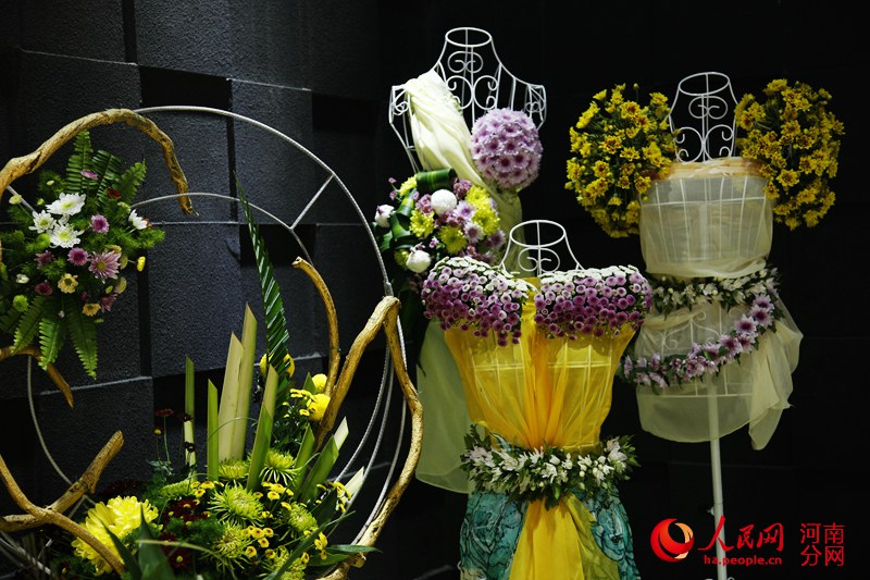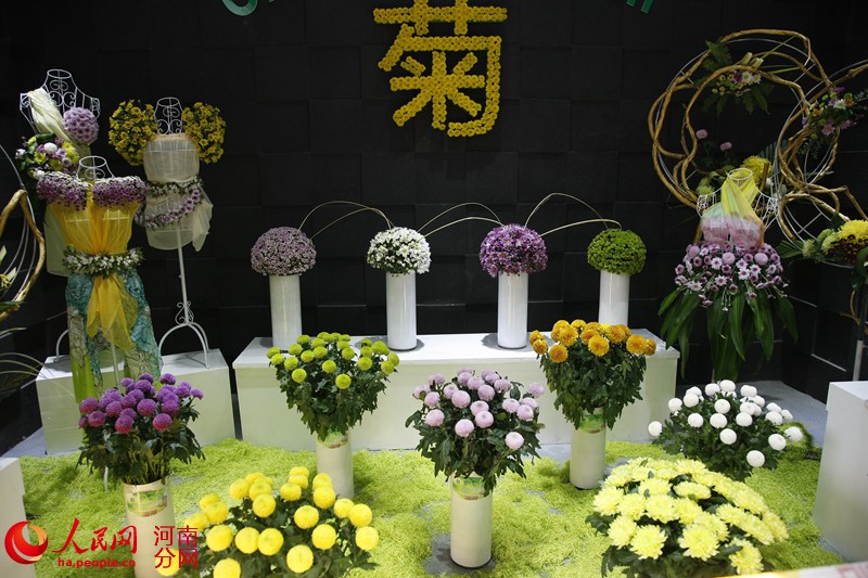 綜合館北廳通過瓶插花藝和大型組合花藝,向游客展示了國內外豐富的菊花品種和精巧的花卉技藝,背景墻上的中英文“菊”字點明了國際菊展的主題。